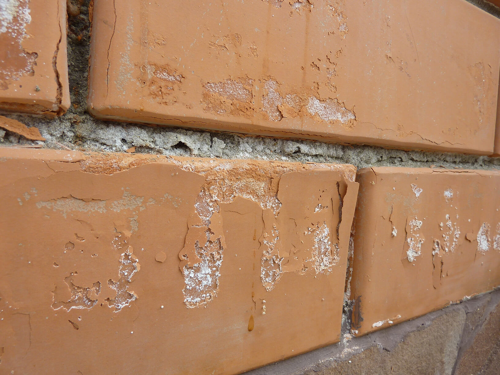 Результат солевой коррозии на фасаде: отшелушивание лицевого слоя, белесые пятна - высолы